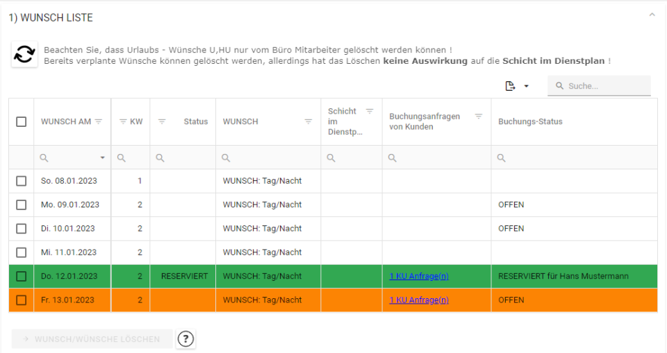 - Wünsche werden an Kunden weitergeleitet, diese können an den MA eine Buchungsanfrage erstellen (oranger Hintergrund).
